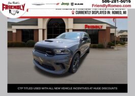 For Your Best Deal it's Jim Riehl's Friendly of Romeo. Browse our online inventory, schedule a test drive, get your trade appraised or investigate finance options. All hassle free! All new vehicles are based on Stellantis Employee Discount.2026 Dodge Durango GT Plus HEMI V8 DB Black Crystal Clearcoat AWD HEMI 5.7L V8 Multi Displacement VVT 8-Speed Automatic$4,457 off MSRP! AWD.We encourage you to browse our online inventory, schedule a test drive, investigate financing options, or get your trade appraised. You can also request more information about a vehicle using our online Contact Us form or by calling us. At Jim Riehl’s Friendly of Romeo we have taken every measure to ensure that our dealerships offer the very best new and used car buying experience. With so much to offer it's no wonder so many Metro Detroit Michigan residents have relied on Jim Riehl's Friendly of Romeo for all of their automotive needs.Check out all the standard equipment Quick Order Package 22T GT Plus (115V Auxiliary Power Outlet, 7 and 4 Pin Wiring Harness, Adaptive Cruise Control with Stop, Auto High Beam Headlamp Control, Auto-Dimming Exterior Driver Mirror, Black Roof Rails, Blind Spot with Trailer Detection, Class IV Receiver Hitch, Dual Remote USB Port - Charge Only, Exterior Mirrors with Heating Element, Exterior Mirrors with Memory, Exterior Mirrors with Supplemental Signals, Floor Console with Leather Armrest, Full Speed Forward Collision Warning Plus, Gloss Black Exterior Mirrors, Heated Second Row Seats, Integrated Roof Rail Crossbars, Leather Trimmed Bucket Seats, Leather Wrapped Door Panels, LED Auxiliary Low Beam and Turn Signal, Power 6x9 Multi-Function Foldaway Mirrors, Power 8-Way Driver Memory 8-Way Passenger Seats, Power Driver/Passenger 4-Way Lumbar Adjust, Power Sunroof, Power Tilt and Telescopic Steering Column, Radio/Driver Seat/Mirrors Memory, Red Accent Stitching, Trailer Brake Control, and Ventilated Front Seats), Tow 'n Go Package (160 Mph Primary Speedometer, Active Noise Control System, Adaptive Damping, Automatic Headlamp Leveling System, Black Brake Calipers, Body Color Upper and Lower Rear Fascia, Brembo Brakes, Drive Modes - Sport/Track/Tow/Snow, Electronic Limited Slip Differential Rear Axle, High Performance Exhaust, High Performance Suspension, Performance Tuned Steering, Quadra-Trac Active on Demand 4WD, and Run Flat Tires), AWD, 2nd Row Fold/Tumble Captain Chairs, 2nd Row Mini Console with Cupholders, 2nd Row Seat Mounted Inboard Armrests, 3.09 Rear Axle Ratio, 3rd row seats: split-bench, 4-Wheel Disc Brakes, 6-Passenger Seating, 9 Speakers, ABS brakes, Air Conditioning, Alloy wheels, AM/FM radio: SiriusXM w/360L, Apple CarPlay/Android Auto, Auto-dimming Rear-View mirror, Auto-leveling suspension, Automatic temperature control, Brake assist, Bumpers: body-color, Cloth Bucket Seats with Shift Insert, Compass, Delay-off headlights, Driver door bin, Driver vanity mirror, Dual front impact airbags, Dual front side impact airbags, Electronic Stability Control, Emergency communication system: Dodge Connect, Four wheel independent suspension, Front anti-roll bar, Front Bucket Seats, Front Center Armrest w/Storage, Front dual zone A/C, Front reading lights, Fully automatic headlights, Garage door transmitter, Heated door mirrors, Heated front seats, Heated steering wheel, Illuminated entry, Knee airbag, Leather steering wheel, Low tire pressure warning, Mini Console 3rd Row Floor Mat, MyFlexCare Service Plan, Navigation System, Occupant sensing airbag, Outside temperature display, Overhead airbag, Overhead console, Panic alarm, ParkView Rear Back-Up Camera, Passenger door bin, Passenger vanity mirror, Power door mirrors, Power driver seat, Power Liftgate, Power steering, Power windows, Radio data system, Radio: Uconnect 5 Nav with 10.1 Display, Rain sensing wipers, Rear air conditioning, Rear anti-roll bar, Rear Load Leveling Suspension, Rear reading lights, Rear seat center armrest, Re