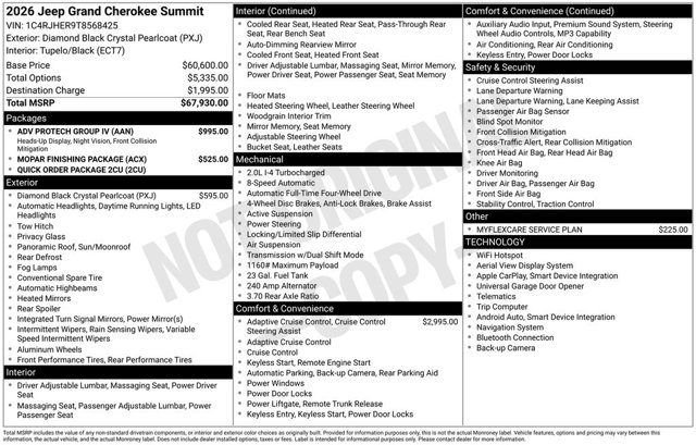 For Your Best Deal it's Jim Riehl's Friendly Auto Group. Browse our online inventory, schedule a test drive, get your trade appraised or investigate finance options. All hassle free!2026 Jeep Grand Cherokee Summit Diamond Black Crystal Pearlcoat 2.0L Hurricane 4 Turbo with ESS 8-Speed Automatic 4WD $9,011 off MSRP!We encourage you to browse our online inventory, schedule a test drive, investigate financing options, or get your trade appraised. You can also request more information about a vehicle using our online Contact Us form or by calling us. At Jim Riehl’s Friendly Automotive we have taken every measure to ensure that our dealerships offer the very best new and used car buying experience. With so much to offer it's no wonder so many Metro Detroit Michigan residents have relied on Jim Riehl's Friendly Auto Group for all of their automotive needs.Check out all the standard equipment ADV Protech Group IV (Heads-Up Display, Night Vision with Pedestrian-Animal Detection, and Windshield Wiper De-Icer), MOPAR Finishing Package (MOPAR Front Splash Guards, MOPAR Paint Protection Film, and MOPAR Rear Splash Guards with Jeep Logo), Quick Order Package 2CU, 19 Speakers, 3.70 Rear Axle Ratio, 4-Wheel Disc Brakes, 4G LTE Wi-Fi Hot Spot, ABS brakes, Active Noise Control System, Adaptive suspension, Air Conditioning, Alloy wheels, AM/FM radio: SiriusXM with 360L, Anti-whiplash front head restraints, Apple CarPlay, AppLink/Apple CarPlay and Android Auto, Audio memory, Auto High-beam Headlights, Auto-dimming door mirrors, Auto-dimming Rear-View mirror, Auto-leveling suspension, Automatic temperature control, Auxiliary Battery, Brake assist, Bumpers: body-color, Compass, Connectivity - US/Canada, Delay-off headlights, Disassociated Touchscreen Display, Driver door bin, Driver vanity mirror, Dual front impact airbags, Dual front side impact airbags, Electronic Stability Control, Emergency communication system, For Details, Visit DriveUconnect.com, Four wheel independent suspension, Front anti-roll bar, Front Bucket Seats, Front Center Armrest w/Storage, Front dual zone A/C, Front fog lights, Front reading lights, Fully automatic headlights, Garage door transmitter, Genuine wood dashboard insert, Genuine wood door panel insert, Global Telematics Box Module (TBM), Gloss Black Exterior Mirrors, Google Android Auto, GPS Antenna Input, Hands-Free Active Driving Assist System, Heated door mirrors, Heated Exterior Mirrors, Heated front seats, Heated rear seats, Heated steering wheel, Illuminated entry, Integrated Center Stack Radio, Integrated Voice Command with Bluetooth, Knee airbag, Leather steering wheel, Low tire pressure warning, Manual Folding Exterior Mirrors, Memory seat, MyFlexCare Service Plan, Navigation System, Normal Duty Suspension, Occupant sensing airbag, Outside temperature display, Overhead airbag, Overhead console, Palermo Leather Seats, Panic alarm, Passenger door bin, Passenger vanity mirror, Power door mirrors, Power driver seat, Power Liftgate, Power moonroof, Power passenger seat, Power steering, Power windows, Radio data system, Radio: Uconnect 5 Nav with 12.3 Display, Rain sensing wipers, Rear air conditioning, Rear anti-roll bar, Rear dual zone A/C, Rear reading lights, Rear seat center armrest, Rear window defroster, Rear window wiper, Remote keyless entry, Security system, Speed control, Speed-Sensitive Wipers, Split folding rear seat, Spoiler, Steering wheel memory, Steering wheel mounted audio controls, Tachometer, Telescoping steering wheel, Tilt steering wheel, Traction control, Trip computer, Turn signal indicator mirrors, USB Host Flip, Variably intermittent wipers, Ventilated front seats, Ventilated rear seats, Voltmeter, and Wheels: 21 x 9.0 Machi Must qualify for FCA Employee Discount, Price includes: $1000 - 2026 National Stellantis Loyalty Bonus Cash . Exp. 04/30/2026 $1500 - 2026 National Retail Bonus Cash . Exp. 04/30/2026 $2000 - 2026 National SFS Lease Loyalty Bonus Cash .