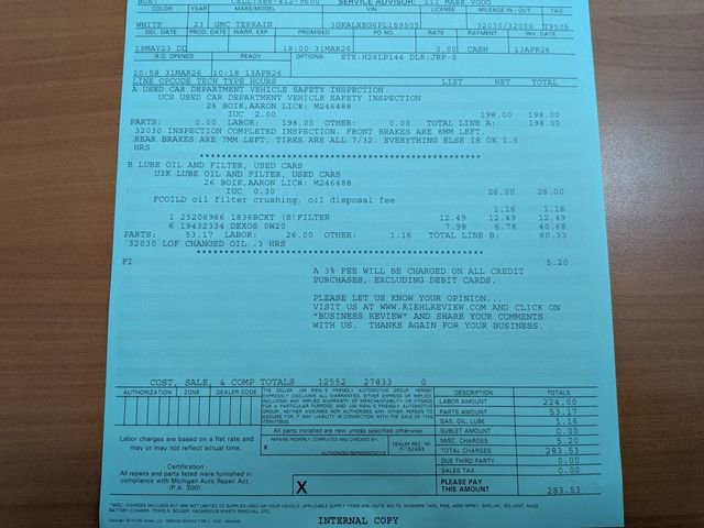Looking for a great deal on a pre-owned vehicle? Jim Riehl's Friendly Automotive Group has a wide selection of quality used cars, trucks, and SUVs to meet your needs and budget. Whether you're in the market for a reliable sedan, a versatile SUV, or a rugged pickup truck, we have something for everyone! All of our used vehicles are thoroughly inspected by our expert technicians to ensure they meet our high standards for performance and safety. With a variety of makes and models available, you’re sure to find the perfect vehicle that fits your lifestyle.2023 GMC Terrain White Frost Tricoat 1.5L DOHC AWD 9-Speed AutomaticCertified. Clean CARFAX. CARFAX One-Owner. 24/28 City/Highway MPG AWD.Certification Program Details: **Dealer-Certified Limited Warranty** This certified vehicle has undergone a rigorous multi-point inspection by skilled automotive technicians to ensure its quality and reliability. Covered components include major powertrain systems such as the engine, transmission, drivetrain, and key electrical and mechanical parts. The certification includes **comprehensive warranty coverage for 12 months or 12,000 miles**, ensuring added peace of mind. Additional benefits may include roadside assistance, towing coverage, trip interruption, and rental car reimbursement. See warranty terms for full details. **Dealership Disclaimer** The dealership makes no express or implied warranties beyond the coverage provided in the certification program. The warranty is subject to specific terms, conditions, and exclusions as outlined in the agreement. Customers are responsible for applicable deductibles and maintenance requirements. This certification does not imply an unlimited guarantee and does not cover wear-and-tear items, routine maintenance, or damages due to misuse or neglect. Please refer to the official warranty documentation for full details.Our experienced sales staff is eager to share their knowledge and enthusiasm with you. Come in today for a free test-drive!We encourage you to browse our online inventory, schedule a test drive, investigate financing options, or get your trade appraised. You can also request more information about a vehicle using our online Contact Us form or by calling us. At Jim Riehl’s Friendly Automotive we have taken every measure to ensure that our dealerships offer the very best new and used car buying experience. With so much to offer it's no wonder so many Detroit Michigan residents have relied on Jim Riehl's Friendly Auto Group for all of their automotive needs.Check out all the standard equipment Preferred Equipment Group 5SA, AWD, 2 USB Data Ports, 2 USB Data Ports w/SD Card Reader, 3.47 Axle Ratio, 4-Wheel Disc Brakes, 6-Way Power Front Passenger Seat, 7 Speakers, 8-Way Power Driver Seat Adjuster, ABS brakes, Air Conditioning, Alloy wheels, AM/FM radio: SiriusXM, Auto High-beam Headlights, Auto-dimming Rear-View mirror, Automatic temperature control, Bluetooth® For Phone, Brake assist, Bumpers: body-color, Cold Air Grille Shutter, Compass, Delay-off headlights, Driver & Front Passenger Heated Seats, Driver door bin, Driver vanity mirror, Dual front impact airbags, Dual front side impact airbags, Electronic Stability Control, Emergency communication system: OnStar and GMC connected services capable, Four wheel independent suspension, Front anti-roll bar, Front Bucket Seats, Front Center Armrest, Front dual zone A/C, Front fog lights, Front Passenger 2-Way Power Lumbar, Front reading lights, Fully automatic headlights, Garage door transmitter, Heads-Up Display, Heated door mirrors, Heated front seats, Heated steering wheel, Illuminated entry, Lane Departure Warning System, Low tire pressure warning, Memory seat, Navigation system: GMC Connected Navigation, Occupant sensing airbag, Outside temperature display, Overhead airbag, Overhead console, Panic alarm, Passenger door bin, Passenger vanity mirror, Perforated Leather-Appointed Seat Trim, Power door