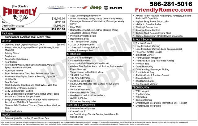 For Your Best Deal it's Jim Riehl's Friendly of Romeo. Browse our online inventory, schedule a test drive, get your trade appraised or investigate finance options. All hassle free! Value Market Pricing and Free CarFax with every vehicle.2024 Jeep Compass Limited Diamond Black Crystal Pearlcoat Limited 2.0L I4 DOHC 8-Speed Automatic 4WD 24/32 City/Highway MPG4WD.We encourage you to browse our online inventory, schedule a test drive, investigate financing options, or get your trade appraised. You can also request more information about a vehicle using our online Contact Us form or by calling us. At Jim Riehl’s Friendly of Romeo we have taken every measure to ensure that our dealerships offer the very best new and used car buying experience. With so much to offer it's no wonder so many Metro Detroit Michigan residents have relied on Jim Riehl's Friendly of Romeo for all of their automotive needs.Check out all the standard equipment Quick Order Package 29G Limited, 4WD, 10.1 Touchscreen Display, 3.73 Final Drive Ratio, 4-Wheel Disc Brakes, 4G LTE Wi-Fi Hot Spot, 6 Speakers, ABS brakes, Air Conditioning, Alloy wheels, AM/FM radio: SiriusXM, Auto High-beam Headlights, Auto-dimming Rear-View mirror, Automatic temperature control, Brake assist, Bumpers: body-color, Compass, Delay-off headlights, Disassociated Touchscreen Display, Driver door bin, Driver vanity mirror, Dual front impact airbags, Dual front side impact airbags, Electronic Stability Control, Emergency communication system: Jeep Connect, For Details, Visit DriveUconnect.com, For More Info, Call 800-643-2112, Four wheel independent suspension, Front anti-roll bar, Front Bucket Seats, Front Center Armrest w/Storage, Front dual zone A/C, Front fog lights, Front reading lights, Fully automatic headlights, Global Telematics Box Module (TBM), Heated door mirrors, Heated front seats, Heated steering wheel, Illuminated entry, Knee airbag, Leather Shift Knob, Leather steering wheel, Leatherette Seats, Low tire pressure warning, Occupant sensing airbag, Outside temperature display, Overhead airbag, Overhead console, Panic alarm, ParkView Rear Back-Up Camera, Passenger door bin, Passenger vanity mirror, Power door mirrors, Power driver seat, Power steering, Power windows, Radio: Uconnect 5 w/10.1 Display, Rain sensing wipers, Rear anti-roll bar, Rear seat center armrest, Rear window defroster, Rear window wiper, Remote keyless entry, Security system, SiriusXM Guardian - Included Trial (B), SiriusXM Radio Service, Speed control, Split folding rear seat, Spoiler, Steering wheel mounted audio controls, Tachometer, Telescoping steering wheel, Tilt steering wheel, Traction control, Trip computer, Turn signal indicator mirrors, Variably intermittent wipers, and Wheels: 18 x 7 Painted Diamond Cut AluminuM.