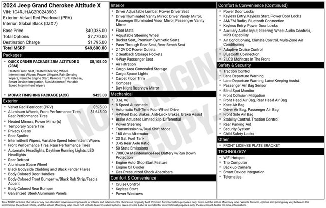 Experience the pinnacle of Jeep's legendary capability with the 2024 Jeep Grand Cherokee Altitude X. This stunning SUV is the perfect blend of rugged performance and refined sophistication, ready to elevate your driving experience to new heights.Boasting a commanding 3.6L V6 24V VVT engine paired with an 8-Speed Automatic transmission and 4-Wheel Drive, the Grand Cherokee Altitude X delivers exceptional power and control on any terrain. Indulge in the convenience of features like the Remote Start System, Wireless Charging Pad, and Heated Steering Wheel, while the Selectable Tire Fill Alert and Rain Sensitive Windshield Wipers ensure you're always prepared for the elements.- QUICK ORDER PACKAGE 23M ALTITUDE X- MOPAR FINISHING PACKAGE- Velvet Red Pearlcoat Exterior- 20 x 8.5 Gloss Black Painted Aluminum WheelsStep inside the Grand Cherokee Altitude X and experience the epitome of comfort and style. The Capri Leatherette/Suede Seats, Power Sunroof, and Heated Front Seats create an inviting and luxurious cabin, while the Uconnect 5 infotainment system with an 8.4 display keeps you connected and entertained.Designed to conquer the road with confidence, the Grand Cherokee Altitude X boasts a suite of advanced safety features, including Electronic Stability Control, Brake Assist, and a ParkView Rear Back-Up Camera. Enjoy the peace of mind that comes with knowing your family is protected on every journey.With an impressive EPA-estimated 19 MPG in the city and 26 MPG on the highway, the Grand Cherokee Altitude X offers exceptional fuel efficiency without compromising its powerful performance. This SUV is the perfect companion for your adventures, whether you're exploring the great outdoors or navigating the city streets.Experience the unparalleled capabilities of the 2024 Jeep Grand Cherokee Altitude X. Visit our showroom today and let us demonstrate how this remarkable SUV can elevate your driving experience. We're confident you'll be impressed by its exceptional features and the value it offers. Take the first step towards owning a true Jeep icon.
