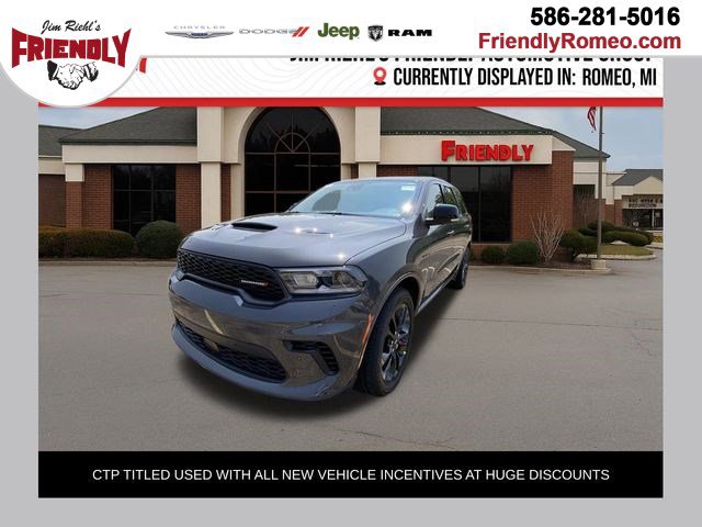 For Your Best Deal it's Jim Riehl's Friendly of Romeo. Browse our online inventory, schedule a test drive, get your trade appraised or investigate finance options. All hassle free! All new vehicles are based on Stellantis Employee Discount.2025 Dodge Durango R/T Plus CTP Vapor Gray AWD CTP HEMI 5.7L V8 Multi Displacement VVT 8-Speed Automatic$10,271 off MSRP! AWD.We encourage you to browse our online inventory, schedule a test drive, investigate financing options, or get your trade appraised. You can also request more information about a vehicle using our online Contact Us form or by calling us. At Jim Riehl’s Friendly of Romeo we have taken every measure to ensure that our dealerships offer the very best new and used car buying experience. With so much to offer it's no wonder so many Metro Detroit Michigan residents have relied on Jim Riehl's Friendly of Romeo for all of their automotive needs.Check out all the standard equipment ParkView Rear Back-Up Camera (Black Roof Rails, Gloss Black Badges, Gloss Black Exterior Mirrors, Integrated Roof Rail Crossbars, Satin Black Dodge Tail Lamp Badge, and Wheels: 20 x 8.0 Black Noise Aluminum), Quick Order Package 22T R/T Plus (115V Auxiliary Power Outlet, 7 & 4 Pin Wiring Harness, Adaptive Cruise Control w/Stop, Auto High Beam Headlamp Control, Auto-Dimming Exterior Driver Mirror, Blind Spot w/Trailer Detection, Class IV Receiver Hitch, Dual Remote USB Port - Charge Only, Exterior Mirrors w/Heating Element, Exterior Mirrors w/Memory, Exterior Mirrors w/Supplemental Signals, Floor Console w/Leather Armrest, Full Speed Forward Collision Warning Plus, Heated Second Row Seats, Leather Trimmed Bucket Seats, Leather Wrapped Door Panels, LED Auxiliary Low Beam & Turn Signal, Power 6x9 Multi-Function Foldaway Mirrors, Power 8-Way Driver Memory 8-Way Passenger Seats, Power Driver/Passenger 4-Way Lumbar Adjust, Power Sunroof, Power Tilt & Telescopic Steering Column, Radio/Driver Seat/Mirrors Memory, Red Accent Stitching, Trailer Brake Control, and Ventilated Front Seats), AWD, 2nd Row Fold/Tumble Captain Chairs, 2nd Row Mini Console w/Cupholders, 2nd Row Seat Mounted Inboard Armrests, 3.09 Rear Axle Ratio, 3rd Row Floor Mat & Mini Console, 3rd row seats: split-bench, 4-Wheel Disc Brakes, 6-Passenger Seating, 9 Speakers, ABS brakes, Air Conditioning, Alloy wheels, AM/FM radio: SiriusXM w/360L, Apple CarPlay/Android Auto, Auto-dimming Rear-View mirror, Auto-leveling suspension, Automatic temperature control, Brake assist, Bumpers: body-color, Cloth Bucket Seats w/Shift Insert, Compass, Delay-off headlights, Driver door bin, Driver vanity mirror, Dual front impact airbags, Dual front side impact airbags, Electronic Stability Control, Emergency communication system: Dodge Connect, Four wheel independent suspension, Front anti-roll bar, Front Bucket Seats, Front Center Armrest w/Storage, Front dual zone A/C, Front reading lights, Fully automatic headlights, Garage door transmitter, Heated door mirrors, Heated front seats, Heated steering wheel, Illuminated entry, Knee airbag, Leather steering wheel, Low tire pressure warning, Navigation System, Occupant sensing airbag, Outside temperature display, Overhead airbag, Overhead console, Panic alarm, ParkView Rear Back-Up Camera, Passenger door bin, Passenger vanity mirror, Power door mirrors, Power driver seat, Power Liftgate, Power steering, Power windows, Radio data system, Radio: Uconnect 5 Nav w/10.1 Display, Rain sensing wipers, Rear air conditioning, Rear anti-roll bar, Rear Load Leveling Suspension, Rear reading lights, Rear seat center armrest, Rear window defroster, Rear window wiper, Remote keyless entry, Security system, Speed control, Speed-sensing steering, Speed-Sensitive Wipers, Split folding rear seat, Spoiler, Sport steering wheel, Steering wheel mounted audio controls, Tachometer, Telescoping steering wheel, Tilt steering wheel, Traction control, Trip computer, Variably intermittent wipers, Voltmet