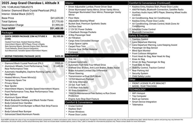 Discover the Pinnacle of Capability and Comfort in the 2025 Jeep Grand Cherokee L Altitude X. This exceptional SUV is poised to elevate your driving experience, blending rugged performance with refined luxury.Meticulously equipped, the Altitude X boasts an impressive array of features that cater to your every need:- Remote Start System- Wireless Charging Pad- Heated Front Seats- Heated Steering Wheel- Power Sunroof- 115V Auxiliary Power Outlet- 3rd Row Charge-Only USB Ports- MOPAR Finishing PackageBeneath the bold, black exterior lies the power of a 3.6L V6 24V VVT engine, paired with an 8-Speed Automatic transmission and 4-Wheel Drive. This dynamic powertrain delivers an exceptional balance of performance and efficiency, with an EPA-estimated 18 city / 25 highway MPG.Step inside the spacious, well-appointed cabin and you'll be surrounded by premium materials and thoughtful design. The Capri Leatherette/Suede seats, along with the heated front seats and steering wheel, provide unparalleled comfort, while the Uconnect 5 infotainment system with an 8.4 display keeps you connected and entertained.Versatility is at the heart of the Grand Cherokee L, with a split-folding third-row seat and a power liftgate that make loading and unloading a breeze. The ParkView Rear Back-Up Camera and advanced safety features, including Blind Spot Monitoring and Rear Cross-Traffic Alert, give you added peace of mind on the road.Whether you're embarking on a family adventure or navigating the daily commute, the 2025 Jeep Grand Cherokee L Altitude X is the perfect companion. Its blend of rugged capability, refined luxury, and cutting-edge technology make it a standout in the segment.Experience the difference for yourself. Visit our showroom and let us demonstrate why the Grand Cherokee L Altitude X is the ultimate expression of Jeep's legendary capability and craftsmanship.