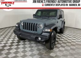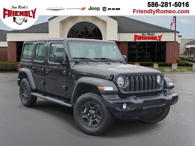 For Your Best Deal it's Jim Riehl's Friendly of Romeo. Browse our online inventory, schedule a test drive, get your trade appraised or investigate finance options. All hassle free! Value Market Pricing and Free CarFax with every vehicle.2025 Jeep Wrangler Sport Black Clearcoat Sport 2.0L I4 DOHC 8-Speed Automatic 4WD 20/22 City/Highway MPGClean CARFAX.We encourage you to browse our online inventory, schedule a test drive, investigate financing options, or get your trade appraised. You can also request more information about a vehicle using our online Contact Us form or by calling us. At Jim Riehl’s Friendly of Romeo we have taken every measure to ensure that our dealerships offer the very best new and used car buying experience. With so much to offer it's no wonder so many Metro Detroit Michigan residents have relied on Jim Riehl's Friendly of Romeo for all of their automotive needs.Check out all the standard equipment Quick Order Package 22B Sport, 110 MPH Vehicle Max Speed Calibration, 3.45 Overall Top Gear Ratio, 4-Wheel Disc Brakes, 8 Speakers, ABS brakes, Air Conditioning, AM/FM radio: SiriusXM, Apple CarPlay/Android Auto, Aux Battery, Black 3-Piece Hard Top, Brake assist, Cloth Low-Back Bucket Seats, Compass, Delay-off headlights, Driver door bin, Driver vanity mirror, Dual front impact airbags, Dual front side impact airbags, Electronic Stability Control, Freedom Panel Storage Bag, Front anti-roll bar, Front Bucket Seats, Front Center Armrest w/Storage, Front fog lights, Front reading lights, Illuminated entry, Integrated roll-over protection, Low tire pressure warning, Mopar Black Fuel Filler Door, Mopar Black Tubular Side Steps, MOPAR Plastic Door Sill Guards, Non-Lock Fuel Cap w/o Discriminator, Normal Duty Suspension, Occupant sensing airbag, Outside temperature display, Overhead airbag, Panic alarm, ParkView Rear Back-Up Camera, Passenger door bin, Passenger vanity mirror, Power steering, Power windows, Radio data system, Radio: Uconnect 5 w/12.3 Display, Rear anti-roll bar, Rear reading lights, Rear Window Defroster, Rear Window Wiper/Washer, Remote keyless entry, Speed control, Split folding rear seat, Steering wheel mounted audio controls, Stop-Start Dual Battery System, Tachometer, Telescoping steering wheel, Tilt steering wheel, Traction control, Trip computer, Variably intermittent wipers, and Wheels: 17 x 7.5 Black Steel Styled.