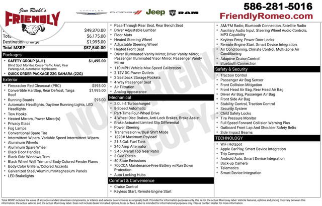 - QUICK ORDER PACKAGE 22G SAHARA -inc: Engine: 2.0L I4 DOHC DI Turbo w/ESS Transmission: 8-Speed Automatic (850RE)