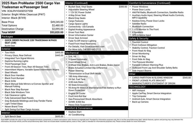 Discover the ultimate work vehicle in the 2025 Ram ProMaster 2500 Base. Designed with the modern professional in mind, this versatile cargo van offers unparalleled capability and convenience to streamline your business operations.- Black, Vinyl Bucket Seats- Passenger Double Seat- Rear Hinged Doors with Fixed Glass- Class IV Receiver Hitch- Cargo Partition with Sliding WindowThis ProMaster 2500 is equipped with a powerful 3.6L V6 engine and a smooth-shifting 9-speed automatic transmission, delivering the performance you need to tackle any job. With a mere 1 mile on the odometer, this van is primed and ready to become your trusted workhorse.Beyond its impressive powertrain, the ProMaster 2500 Base boasts an array of thoughtful features to enhance your driving experience. Enjoy the convenience of remote keyless entry, steering wheel-mounted audio controls, and a ParkView Rear Back-Up Camera for effortless maneuvering. Stay connected with the Uconnect 5 infotainment system, complete with a 7-inch display, SiriusXM Radio, and Apple CarPlay/Android Auto compatibility.For your safety and peace of mind, this ProMaster 2500 is equipped with advanced technologies like Electronic Stability Control, Traction Control, and Brake Assist. The Heavy Duty Suspension and 4-Wheel Disc Brakes ensure a smooth, confident ride, even when fully loaded.Designed with the needs of professionals in mind, the 2025 Ram ProMaster 2500 Base is the ultimate work companion. Experience the uncompromising performance, versatility, and technology that will elevate your business to new heights. Contact us today to schedule a test drive and discover how this exceptional cargo van can transform the way you work.