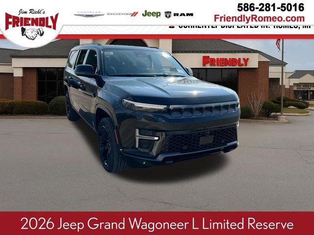 For Your Best Deal it's Jim Riehl's Friendly of Romeo. Browse our online inventory, schedule a test drive, get your trade appraised or investigate finance options. All hassle free! Value Market Pricing and Free CarFax with every vehicle.2026 Jeep Grand Wagoneer L Limited Reserve High Gloss Black Limited Reserve 3.0L I6 8-Speed Automatic 4WDClean CARFAX.We encourage you to browse our online inventory, schedule a test drive, investigate financing options, or get your trade appraised. You can also request more information about a vehicle using our online Contact Us form or by calling us. At Jim Riehl’s Friendly of Romeo we have taken every measure to ensure that our dealerships offer the very best new and used car buying experience. With so much to offer it's no wonder so many Metro Detroit Michigan residents have relied on Jim Riehl's Friendly of Romeo for all of their automotive needs.Check out all the standard equipment Black Appearance Package (118 MPH Maximum Speed Calibration, Black Exterior Accents, Titanium Daylight Opening Upper, Titanium Upper Grille Applique, and Wheels: 22 x 9 Painted Gloss Black), HD Trailer Tow Package (Adjustable Roof Rail Crossbars, Blind Spot with Trailer Detection, Elec Rear Limited Slip Differential, Removable Rear Tow Hooks, Selec-Speed Control, Trailer Brake Control, Trailer Hitch Zoom, Trailer Light Monitoring, Trailer Tire Pressure Monitoring System, and Vapor Tow Hooks), Limited Reserve Package, Quick Order Package 29D Reserve (19 Speaker McIntosh Audio System, 2nd Row Manual Window Shades, 3 Panel Sunroof, Augmented HUD, Cluster 12 TFT Color Display, Instrument Panel, Interior Rear Facing Camera, Luxury Front and Rear Floor Mats, P and P Park and Unpark Assist with Stop System, Pirelli Brand Tires, Power Deployable Running Boards, Quadra-Lift Air Suspension, Reversible Carpet/Vinyl Cargo Mat, Semi Active Damping, Side Distance Warning, Smartphone as a Key Prep, and Surround View Camera System), 3rd row seats: bench, 4-Wheel Disc Brakes, 9 Speakers, ABS brakes, Air Conditioning, Alloy wheels, AM/FM radio: SiriusXM with 360L, Anti-whiplash front head restraints, Apple CarPlay/Android Auto, Audio memory, Auto Adjust in Reverse Exterior Mirrors, Auto High-beam Headlights, Auto-dimming door mirrors, Auto-Dimming Exterior Driver Mirror, Auto-dimming Rear-View mirror, Auto-leveling suspension, Automatic temperature control, Brake assist, Bumpers: body-color, Compass, Delay-off headlights, Driver door bin, Driver vanity mirror, Driver's Seat Mounted Armrest, Dual front impact airbags, Dual front side impact airbags, Electronic Stability Control, Emergency communication system: Jeep Connect, Exterior Mirrors Approach Lamps, Exterior Mirrors with Memory, Exterior Mirrors with Supplemental Signals, Exterior Parking Camera Rear, Four wheel independent suspension, Front anti-roll bar, Front Bucket Seats, Front Center Armrest w/Storage, Front dual zone A/C, Front fog lights, Front reading lights, Fully automatic headlights, Garage door transmitter, Heated door mirrors, Heated Exterior Mirrors, Heated front seats, Heated rear seats, Heated steering wheel, Illuminated entry, Knee airbag, Leather Trimmed Bucket Seats, Low tire pressure warning, Manufacturer Statement of Origin, Memory seat, MyFlexCare Service Plan, Navigation System, Normal Duty Suspension, Occupant sensing airbag, Outside temperature display, Overhead airbag, Overhead console, Panic alarm, Passenger door bin, Passenger seat mounted armrest, Passenger vanity mirror, Power door mirrors, Power driver seat, Power Liftgate, Power passenger seat, Power steering, Power windows, Radio data system, Radio: Uconnect 5 Nav with 12 Display, Rain sensing wipers, Rear air conditioning, Rear anti-roll bar, Rear reading lights, Rear seat center armrest, Rear window defroster, Rear window wiper, Reclining 3rd row seat, Remote keyless entry, Security system, Speed control, Speed-sensing steering, Speed-Sensitive